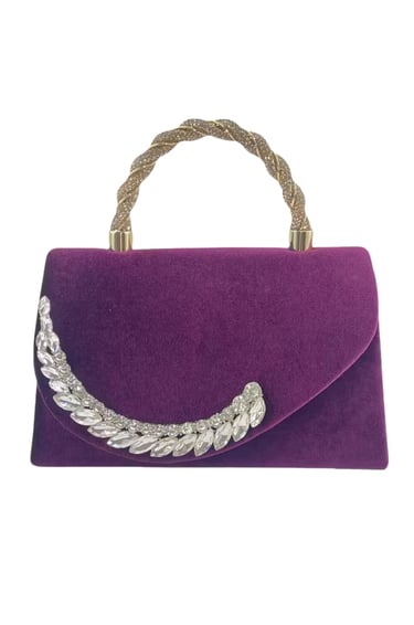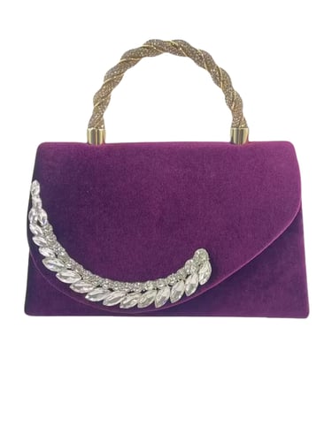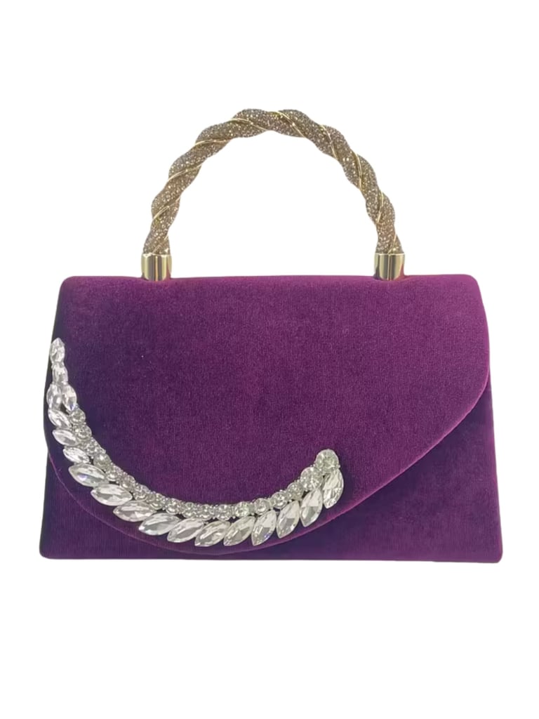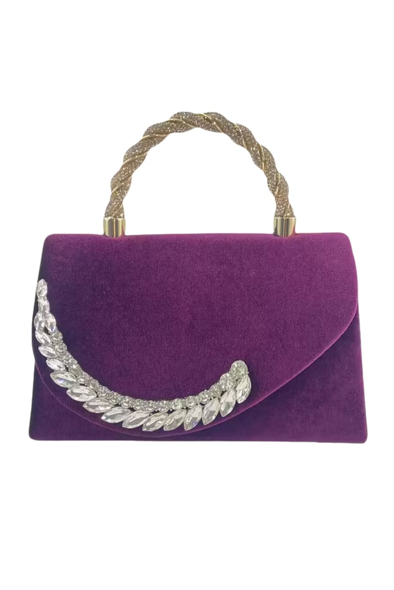 Make a statement with this elegant purple faux suede clutch, featuring sparkling rhinestone trim and a chic chain handle. The magnetic closure keeps essentials secure, and the removable strap lets you wear it as a clutch or shoulder bag. Perfect for business events, weddings, dates, or any formal occasion. Soft polyester lining adds a refined touch.